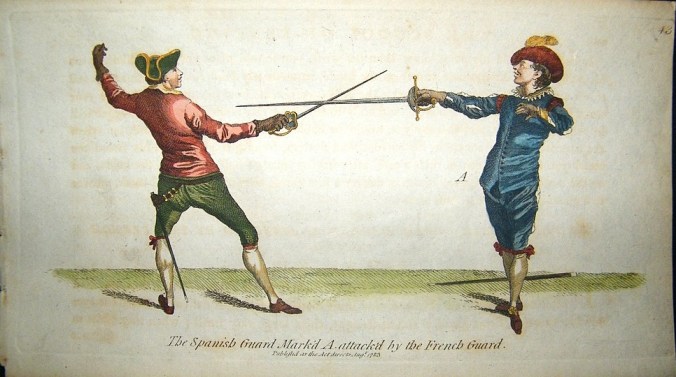 Some may argue that Destreza is tangential to the study of the smallsword, and there is some merit to that argument. However, one can consider Destreza somewhat as an ancestral cousin of the smallsword. Regardless of where you fall in this argument, there is no doubt that a smallsworder of the French or English school could easily have crossed swords with a Spanish practitioner. To that end, I offer you Angelo’s plate 43 from his 1783 publication: